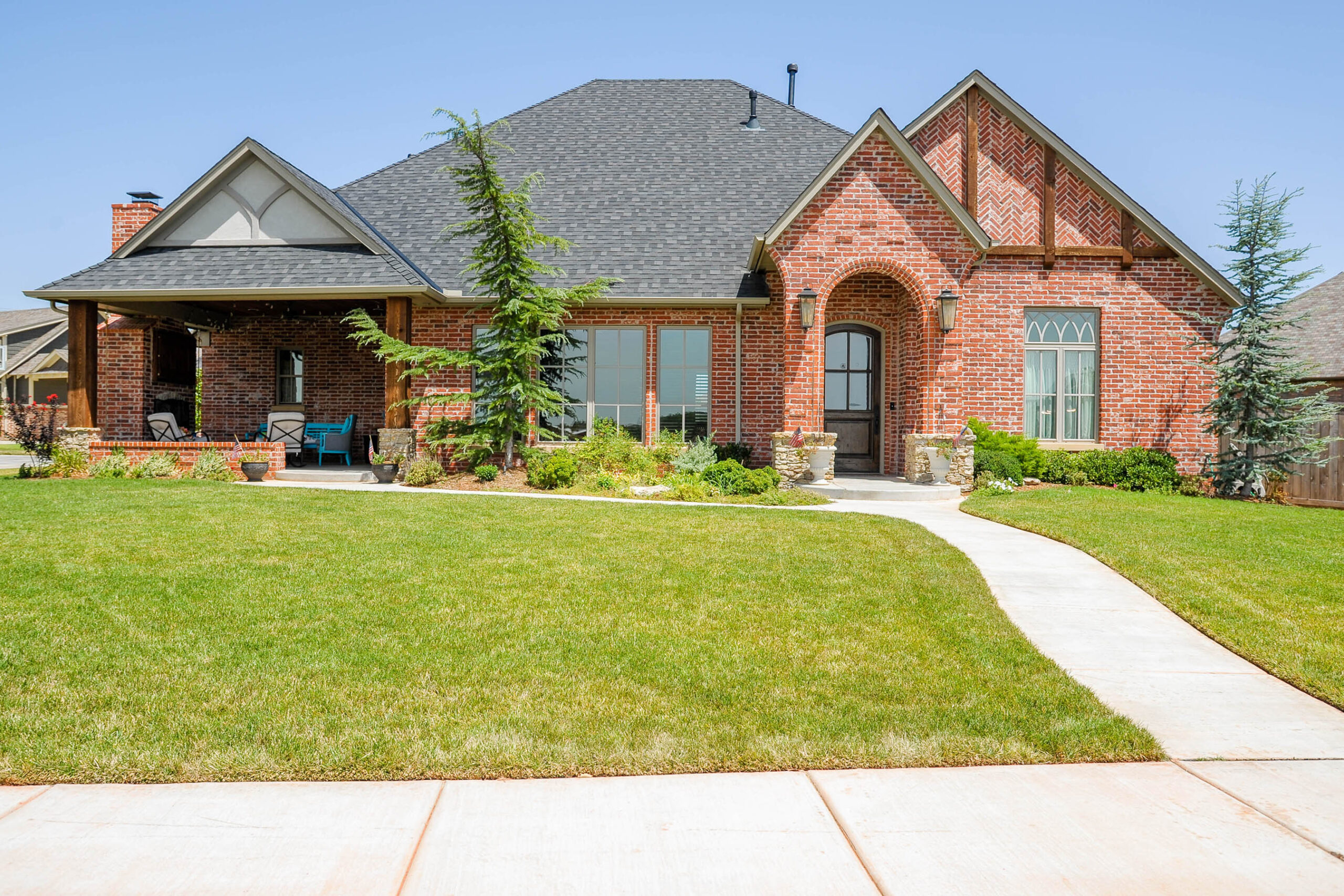 Rustic home is so amazing with a corner open covered patio, outdoor fireplace and TV. Spacious Hearth room with french doors opens to living room. Living room has a corner fireplace 10′ ceilings and a hallway behind fireplace that leads to master bedroom. Master bedroom has 10′ ceilings and a door out to covered patio. Master bathroom has open shower, tub, double sink vanity, and wide open walk in closet. Guest bedroom at front entry with full hall bathroom and a large walk in closet. Kitchen has a long island, large walk in pantry, opens to a spacious dining room. Utility room is quite impressive with mud bench, fridge, counter with sink, wall of cubbies, drip rod and powder bath. Staircase in living room leads up to three bedrooms, shared hall bathroom and walk in closets.