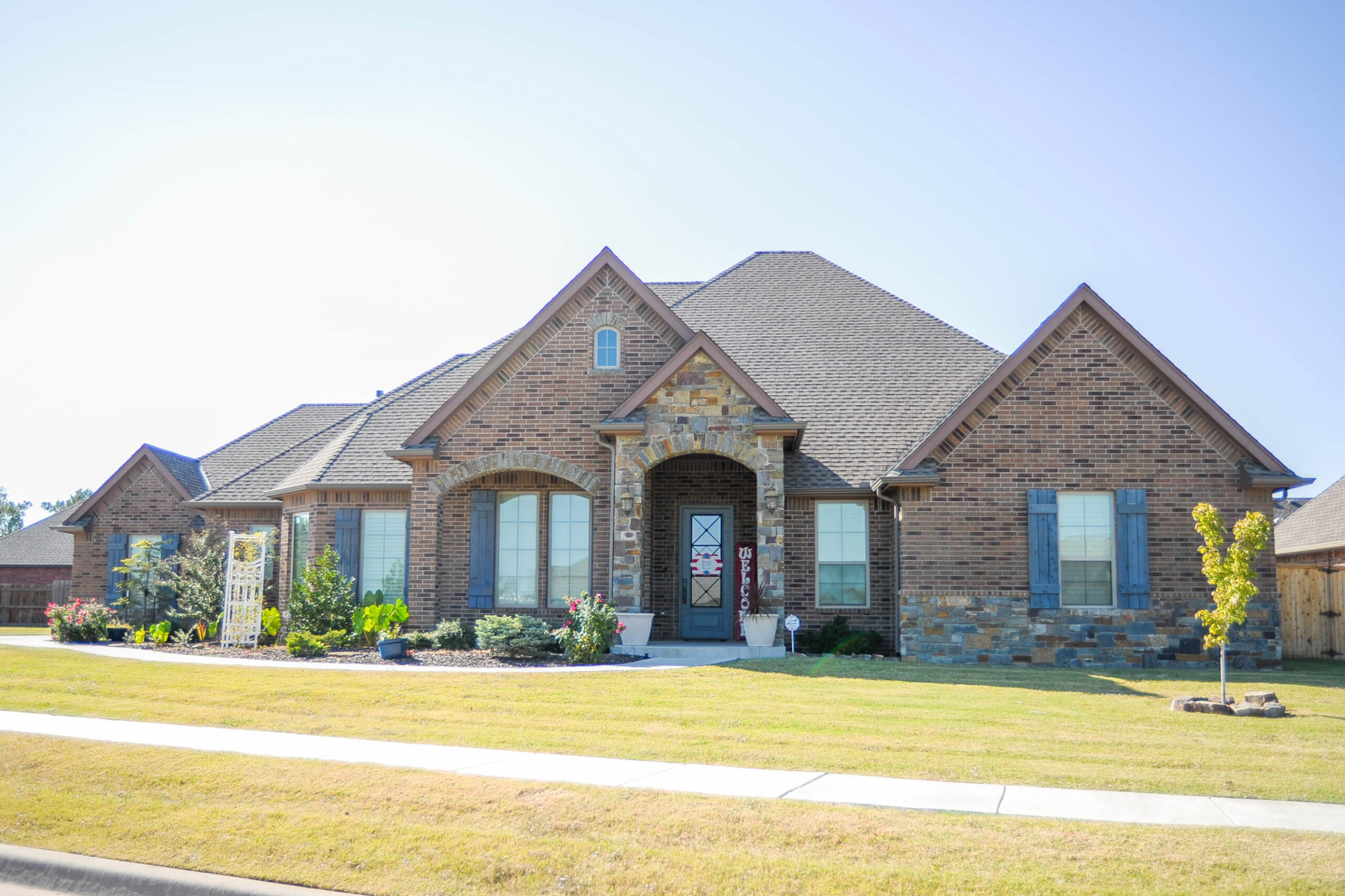 French country style home has a open formal dining room and study with french doors. Three more bedrooms one has bathroom access to hall bath. Two other bedrooms have walk in closets and jack/Jill bath. Media room in back with double doors no windows that open to living room. Living room has a fireplace and three windows with cathedral ceilings. Kitchen has a island and corner pantry with dinette and patio access. Master bedroom has 10′ box ceilings and a bathroom with walk in closet , access to utility room, open door less shower, tub, and double sinks. Large impressive front porch and covered patio. Great house for acre lot.