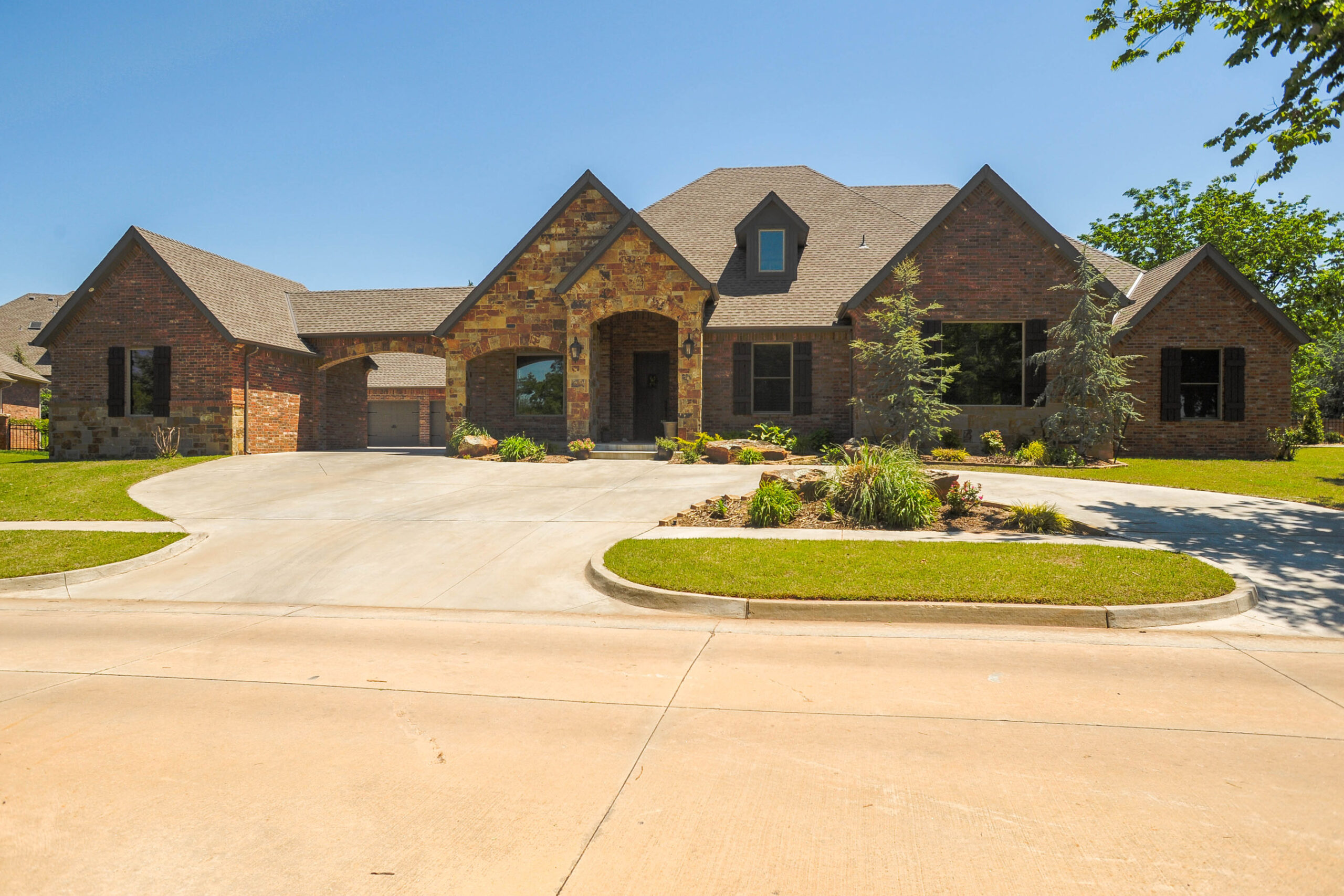 Luxury home style has a beautiful open front porch. Study and formal dining are both open to entry with 10′ ceilings. Down hall gallery is a powder bath, rec room with double doors, a wet bar, 11′ ceilings and walk in closet. Two bedrooms have jack/Jill bathroom and walk in closets. Fourth bedroom has a private bath and walk in closet and 9′ ceilings. Living room has a corner fireplace and picture window. Dinette has two windows and garden door that leads out to a massive covered patio with counter top and a sink. Kitchen has so much counter space, huge walk in pantry and center island. Master bedroom has 9′-10′ box ceilings. Master bath has split walk in closets and access to utility room ,open walk in shower, tub and split sink vanity. Mud bench room goes out to a three car garage with extra storage space and staircase up to attic. Safe room is across from utility room with sink cabinet, freezer, wall ironing board, and drip rod. Fourth garage is a single with breezeway to connect to house.
