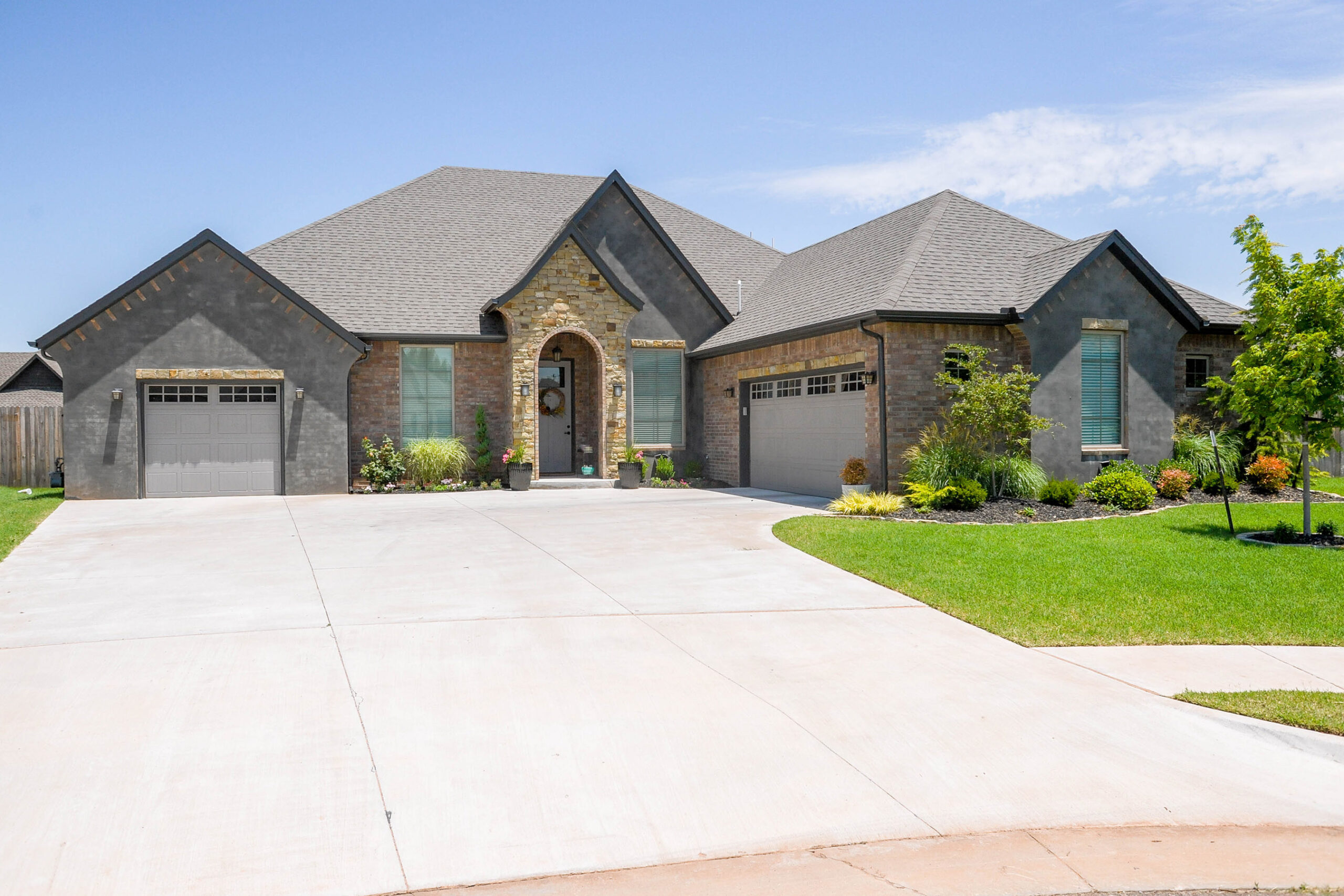 French country style has split garage one car has access through mud room. Study at entry with double doors and formal dining room with 10′ ceilings. Spacious open living room with cathedral ceilings, tall fireplace, double doors to a game room. Kitchen has island, walk in pantry, and dinette. Master bedroom has 9′-10′ ceilings, bathroom has door less shower, tub, walk in closet and access to utility room.Two other bedrooms have walk in closets and jack/Jill bath, hall linen and coat closet. Down bedroom hallway is access to two car garage.
