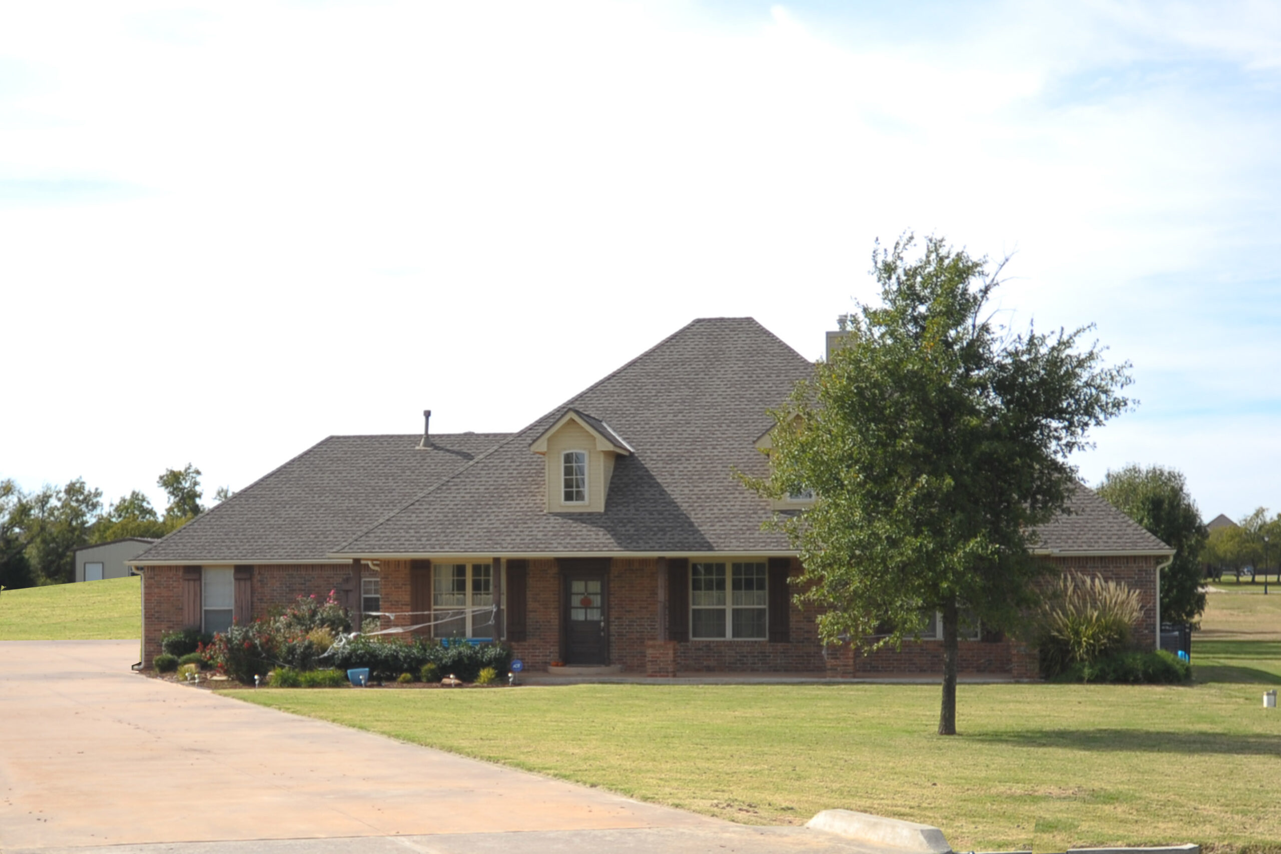 Farm house has a wrap around country porch with 6 post on front. Deep entry with wide case openings into formal dining and living room. Dining has 10′ Pullman ceilings and living has cathedral ceilings, and a corner fireplace. Two bedrooms have walk in closets, full hall bath. Master bedroom is so huge and spacious with 10′ Pullman ceilings, a door out to covered patio. Master bath has walk in closet, corner garden tub, shower. Study with french doors behind living room and door out to patio. Powder bath going into kitchen with 10′ Pullman ceilings, center island, pantry. Dinette with garden door out to patio. Stairs going up for attic access, utility room with sink counter, freezer, counter for folding. Fourth bedroom has walk in closet and full private bath. Three car over sized garage with extra storage space, big mud bench.