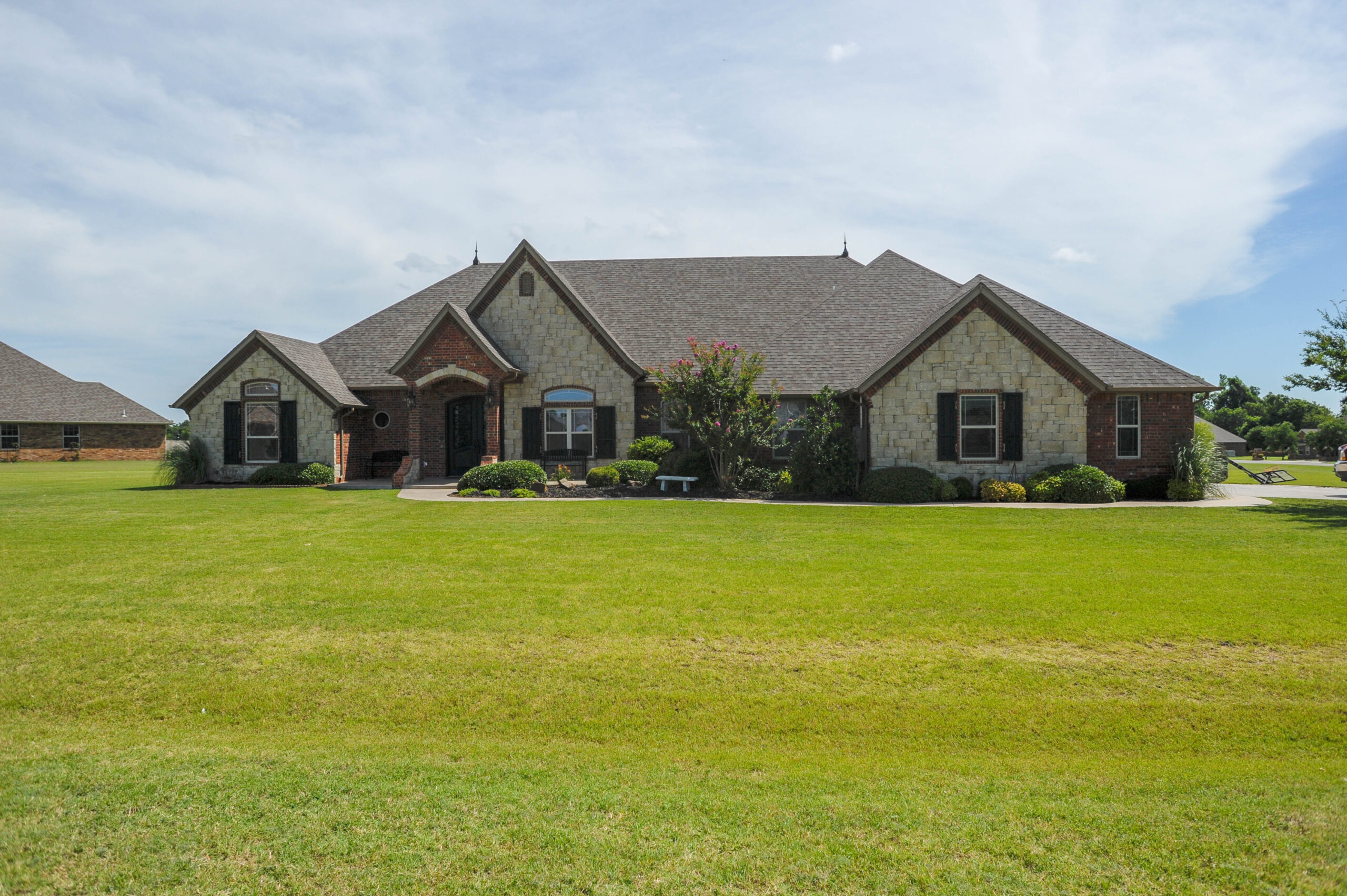 French country home has such a beautiful entrance. Deep open entry with staircase leading up to a bonus room, full bath and walk in closet. Spacious open formal dining room with 10′ ceilings that flow into living room. Living room has a fireplace, three windows on back wall. Kitchen has a island, corner pantry and dinette with a bay window and door out to patio. Study has double doors and bookcase on each side. Fifth bedroom has a walk in closet next to a full hall bath. Utility room has a counter sink, ironing wall board, and closet and access to master closet. Master bedroom has 10′ ceilings, picture window, and double doors leading into bath. Master bath has wrap around walk in closet, open walk in shower, corner garden tub, and double sink vanity. Three car garage is super spacious has extra room great for trucks or SUV and a walk in storage closet safe room. Three more incredible bedrooms all share a full hall bath and have standard closets. Great spacious back covered patio with two corner post.