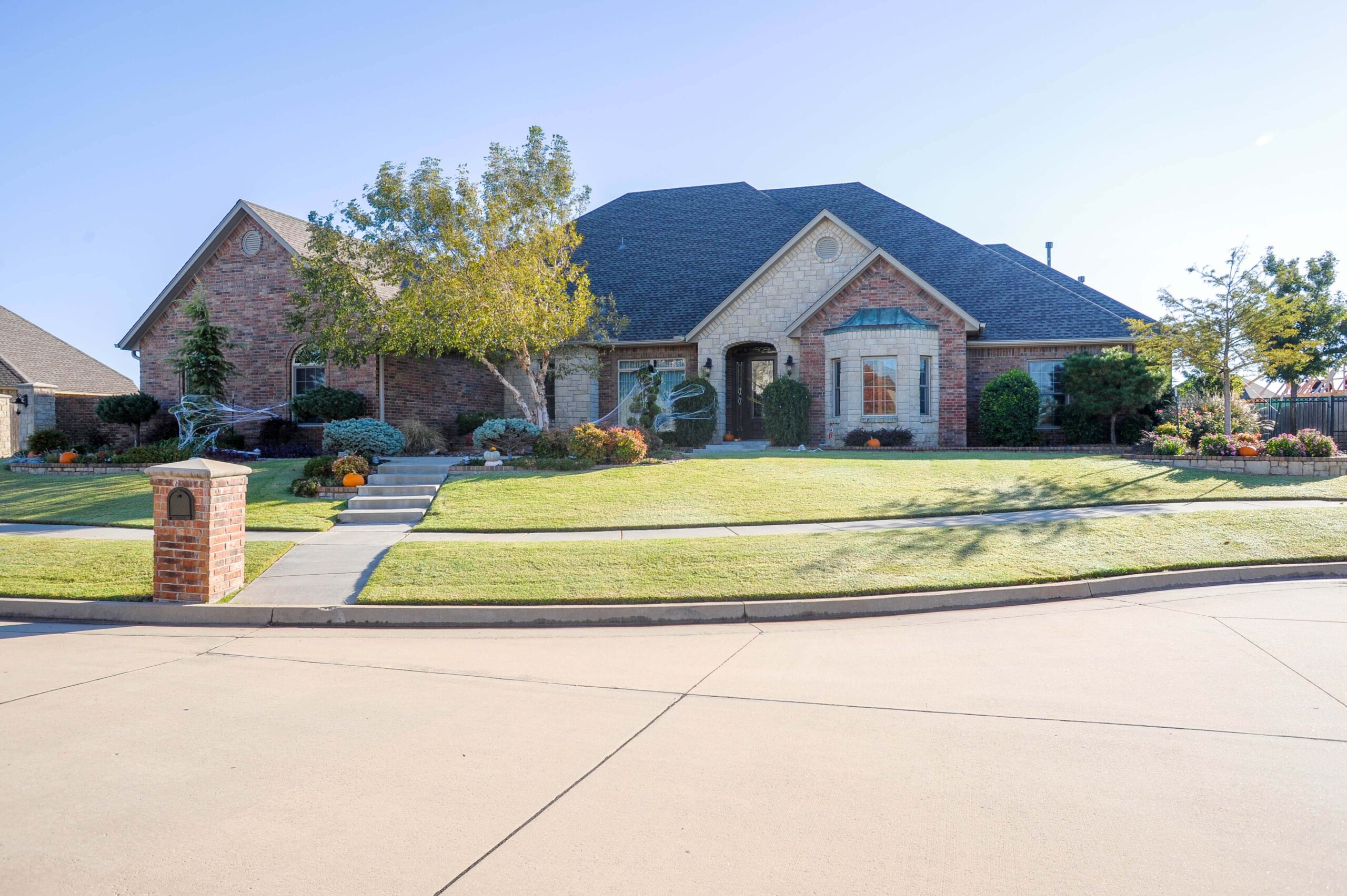 French country home has so much charm open archways into entry. Study with french doors, bay window, closet and extra door out to a hall. Formal dining room with 13′ ceilings, wet bar and double case opening. Utility room has a drip rod, counter with sink and freezer. Double doors flow into family room, wet bar counter with sink and pass through fireplace, storage closet in back. Two bedrooms that share a hall bath, and a powder bath and linen closet. Three car garage with extra storage space, storage closet. Kitchen has plenty of cabinets and counter space, corner pantry, center island, opens to dinette with four windows and garden door. Pass through fireplace from family room to breakfast nook. Living room has a built in entertainment center, three windows and 10′ ceilings. Fourth bedroom has 9′ ceilings, walk in closet and access from bedroom to hall bath, with open walk in shower. Master bedroom has octagon 10′ ceilings, art nook and garden door. Master bath has large walk in closet with half of it a safe room, corner garden tub, shower, double sinks. Large covered patio with access from master to dinette.
